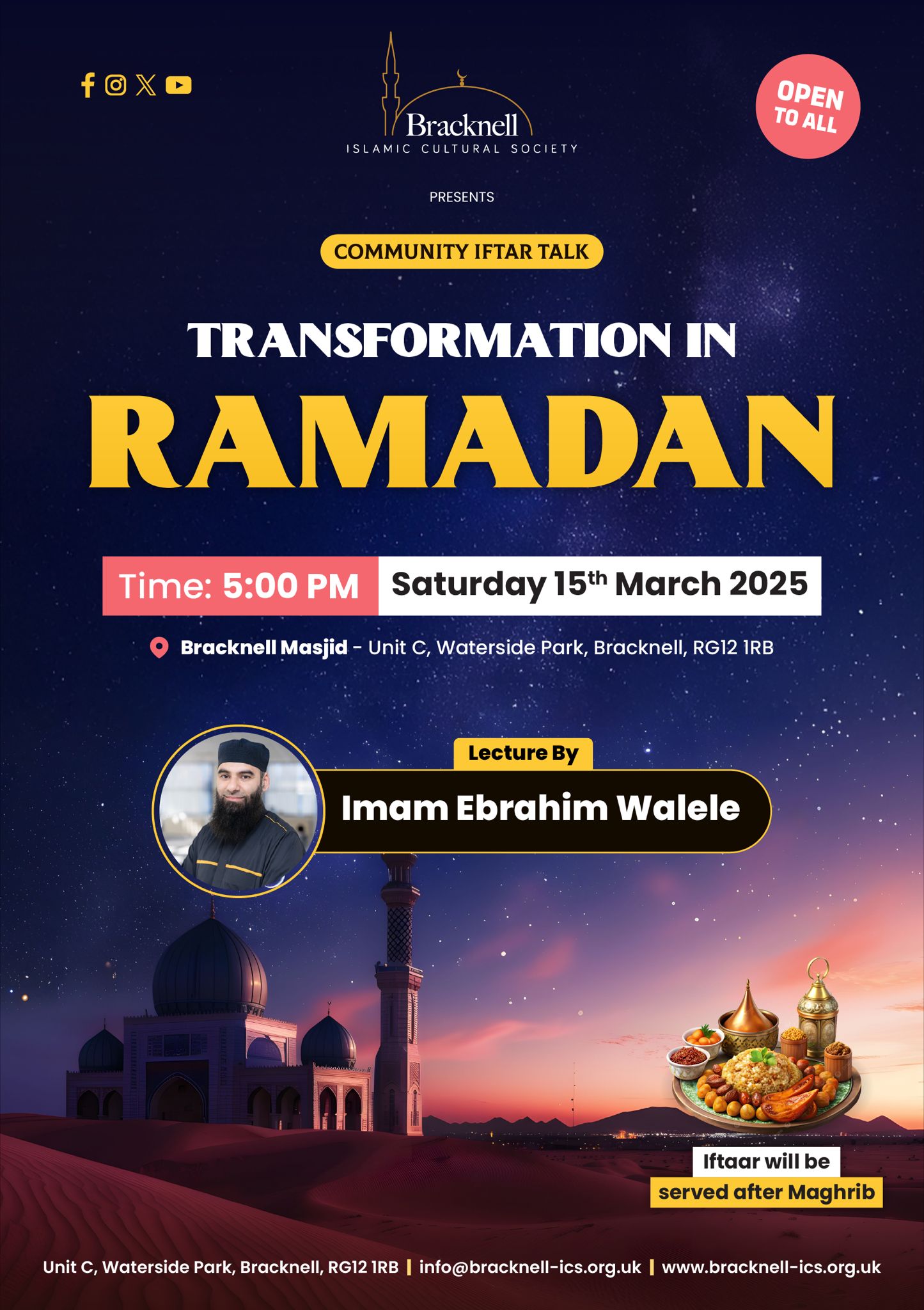 Join us for our special reminder by Imam Ebrahim on Transformation in Ramadan followed by Community iftar.